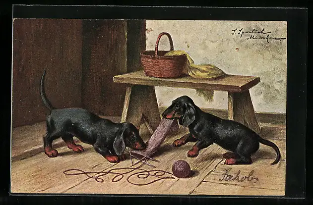 Künstler-AK Zwei Dackel machen sich über einen Strickstrumpf her