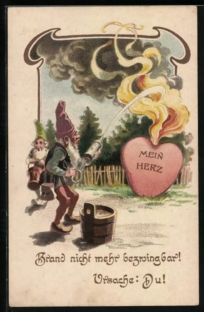 Künstler-AK Zwerge löschen entflammtes Herz, Brand nicht mehr bezwingbar! Ursache: Du!