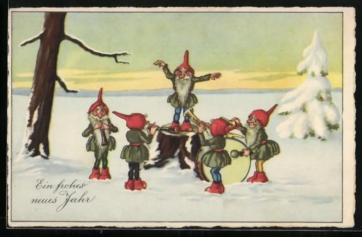 Künstler-AK Zwerge machen Musik in einer Schneelandschaft