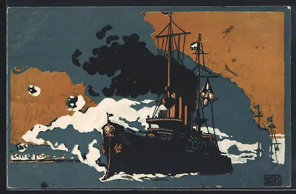 Künstler-AK sign. Adolf Scholz: Kriegsschiffe in Fahrt