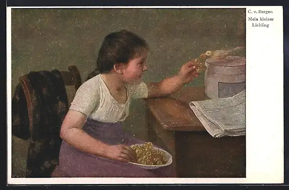 Künstler-AK sign. C. v. Bergen: Mein kleiner Liebling, Mädchen füttert Vogel mit Weintrauben