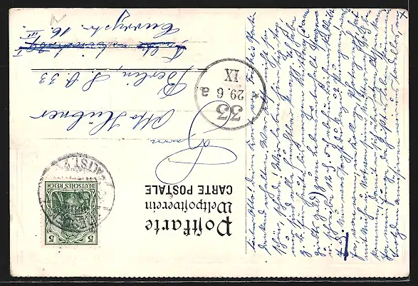 Personenbezogene Daten auf der Rückseite der Karte wurden durch blauen Textmarker unkenntlich gemacht. Die blauen Stellen sind auf die Vorderseite durchgeweicht und wirken sich negativ auf das Postkartenfoto aus