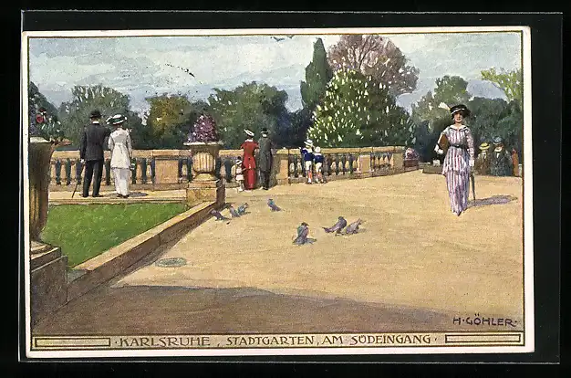 Künstler-AK sign. H. Göhler: Karlsruhe, Stadtgarten am Südeingang mit Spaziergängern und Tauben