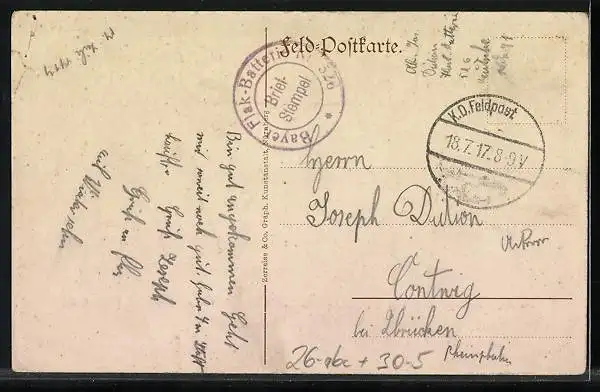 alte Ansichtskarte, gelaufen 1917, Eckknick oben re., kl. Einriss re. oben, guter Zustand