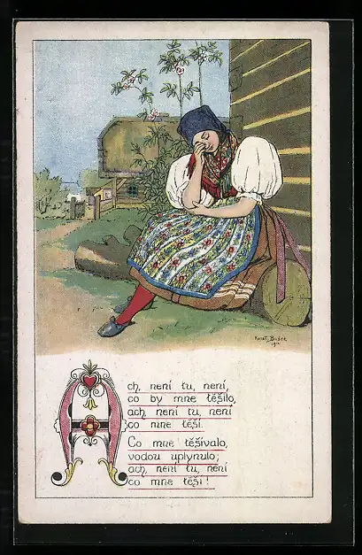 Künstler-AK sign. Konst. Busek: Junge Frau in Tracht sitzt weinend am Wegesrand, Gedicht darunter