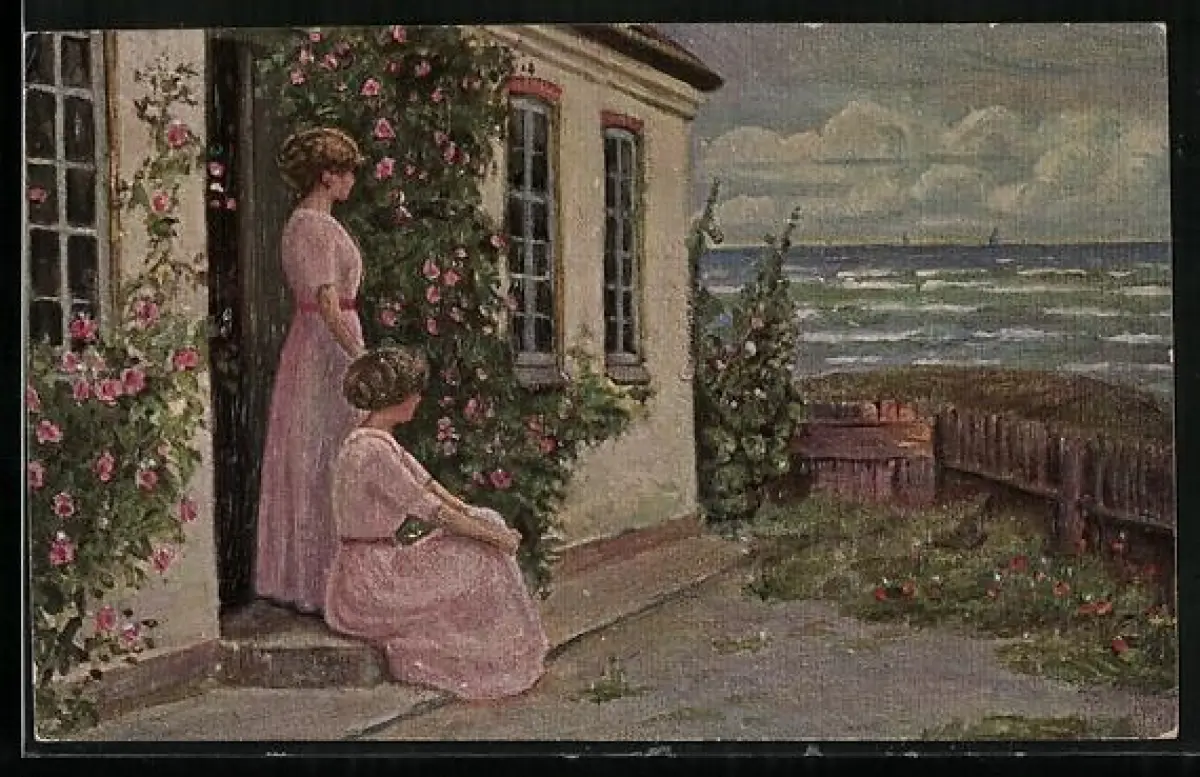 Künstler-AK sign. L. Mogelgaard: Rote Rosen, zwei Damen gucken aufs Meer hinaus, Dänische Kunst