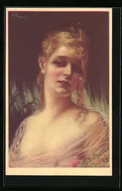 Künstler-AK sign. M. Vinca: Hübsche Dame mit blondem Haar und tiefem Dekollete