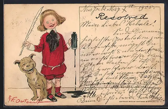 Künstler-AK sign. R. F. Outcault: Kind und Hund mit Tinte und Feder