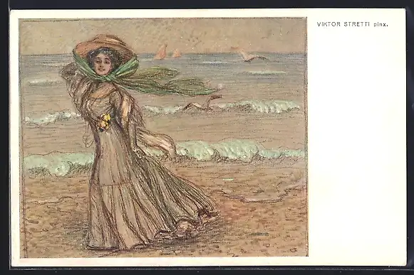Künstler-AK sign. Viktor Stretti: Frau in mit Strohhut am Strand