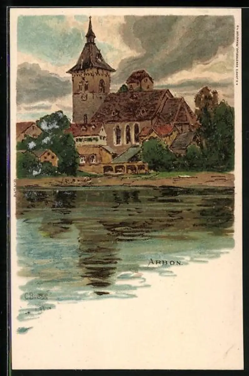 Künstler-Lithographie Carl Biese: Arbon, Blick zur Kirche