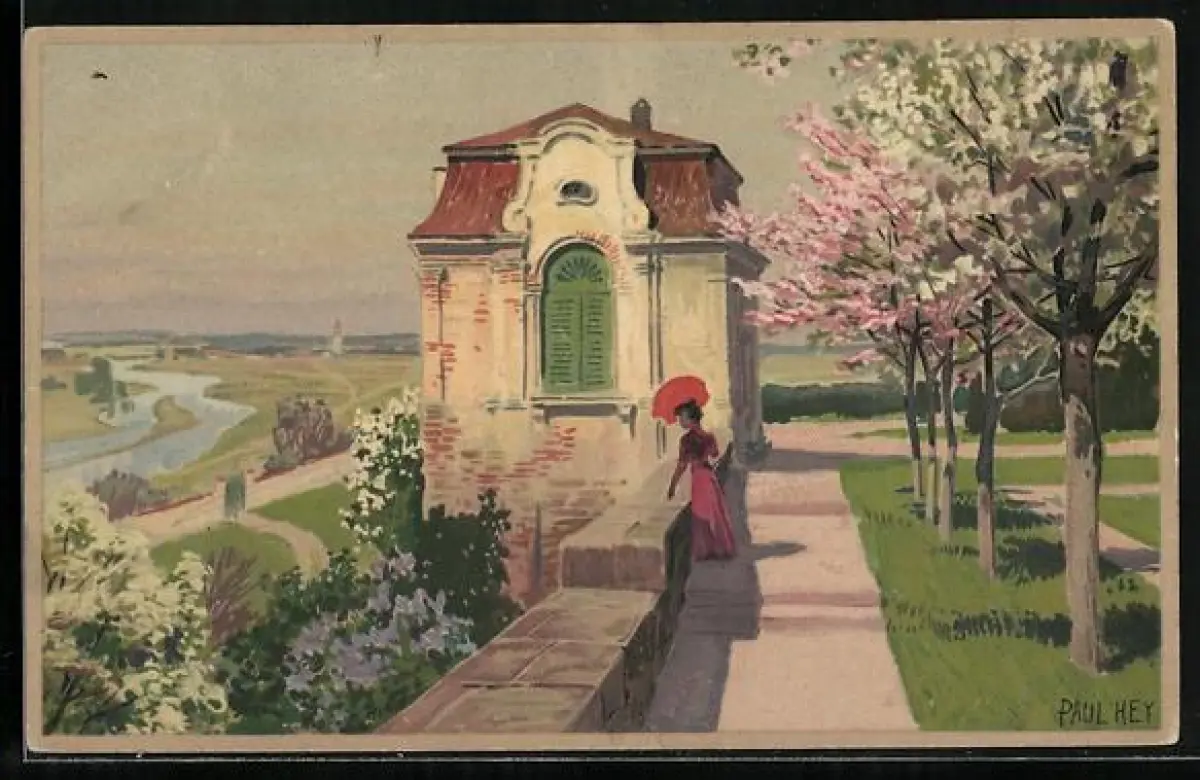 Künstler-Lithographie P. Hey: Frau an der Mauer geniesst die schöne Aussicht