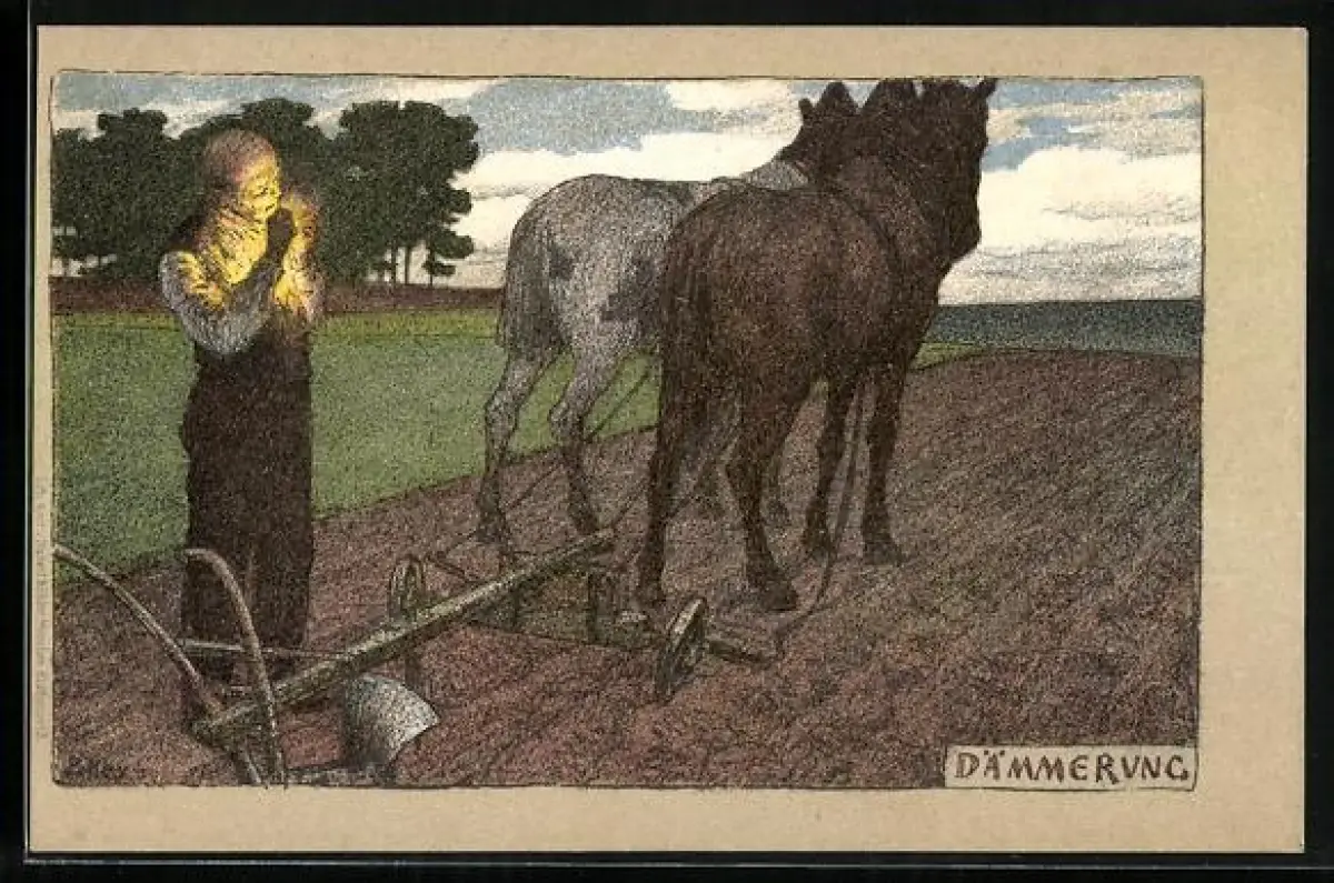 Künstler-Lithographie Paul Hey: Dämmerung, Bauer mit Pferdepflug