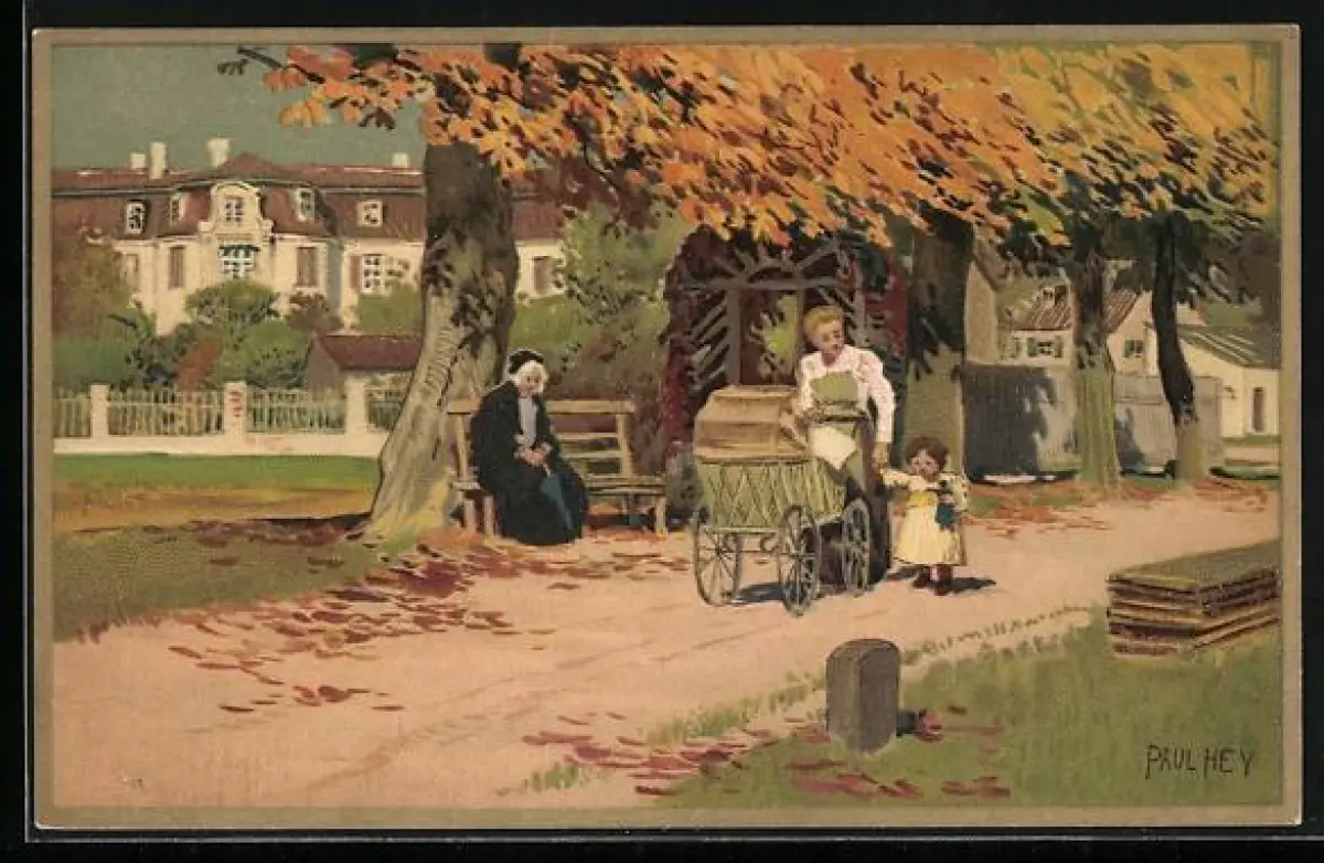 Künstler-Lithographie Paul Hey: Mutter geht mit ihren Kindern spazieren