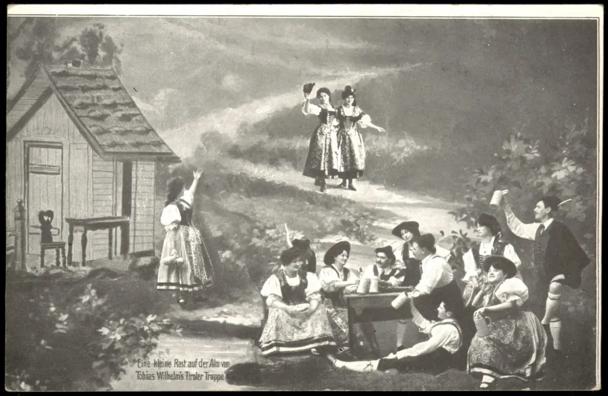 Künstlerkarte "Eine kleine Rast auf der Alm" Tirol Tiroler Truppe in Tracht 1910