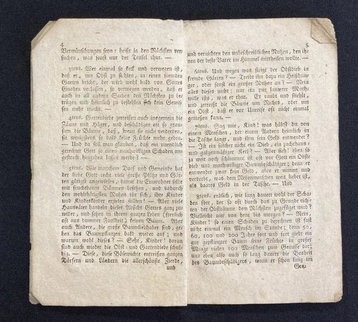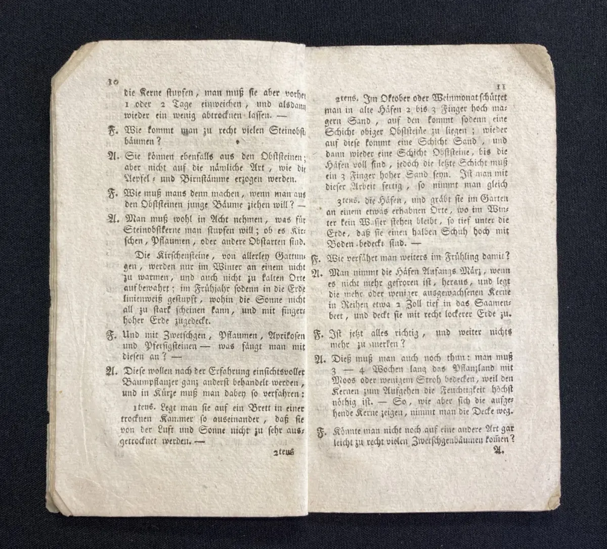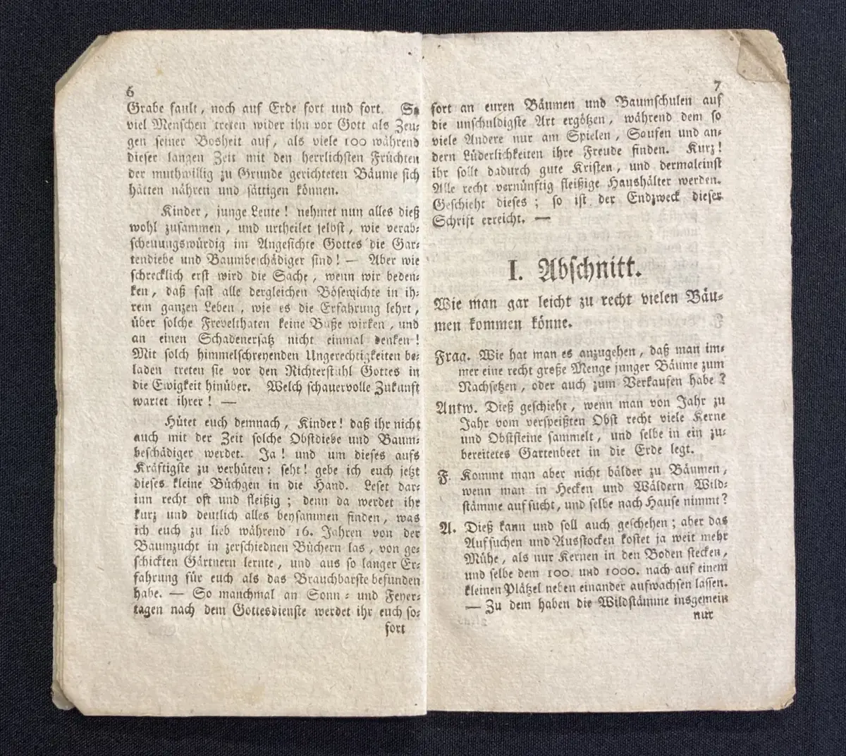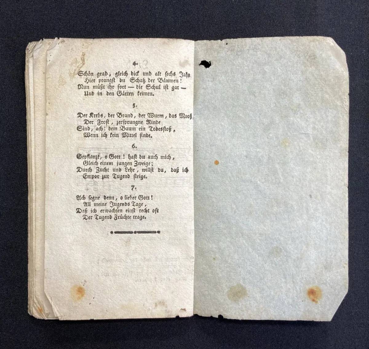 Alle Ecken knickspurig, Rücken wurmspurig. Einband fleckig und ebenso mit Wurmfraß, sowie hinten mit kleinerer Fehlstelle auf dem hinteren Deckel.