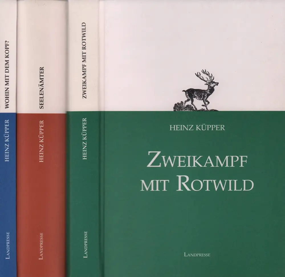 [1] Wohin mit dem Kopf? Kriminalerzählung. (1998). (393013764X). / [2] Seelenämter. Roman. (2000). (1. Aufl. ISBN 3930137860). / [3. Zweikampf mit Rotwild. Ein Roman nach Motiven bei Heinrich von Kleist. (1996). (1. Aufl. ISBN 3930137410). - Limitierte Vorzugs-Ausgabe. - Dreh- u. Angelpunkt dieser Romane ist jeweils eine Kriminal-Geschichte ist, in der der Marinepfarrer a.D. Jakob entscheidend zur Auflösung beiträgt. - Heinz Küpper (1930-2005), Schriftsteller u. Pädagoge. - Gutes, sauberes Exemplar