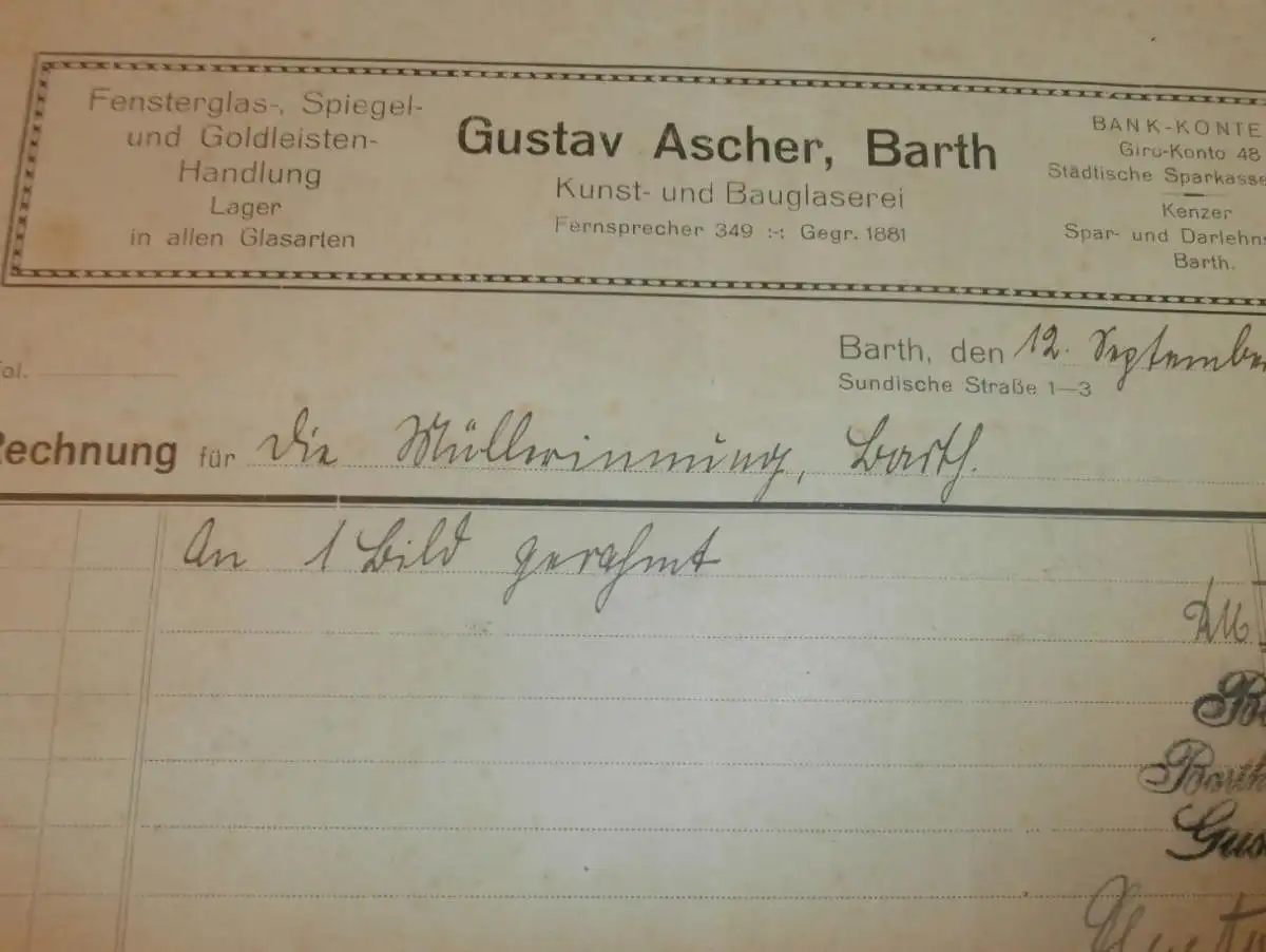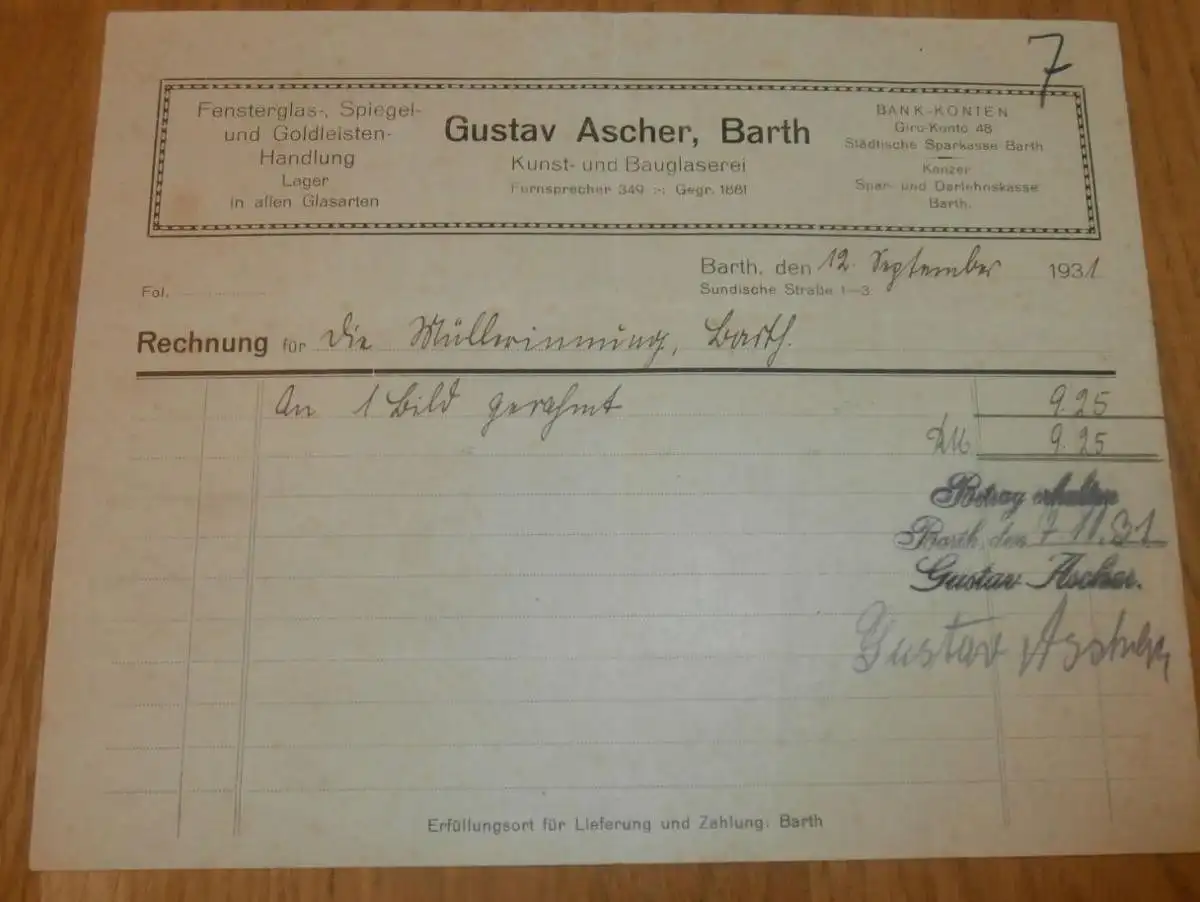 Kunst-Glaserei Gustav Ascher in Barth , 1931 , alte Rechnung , Mecklenburg !!