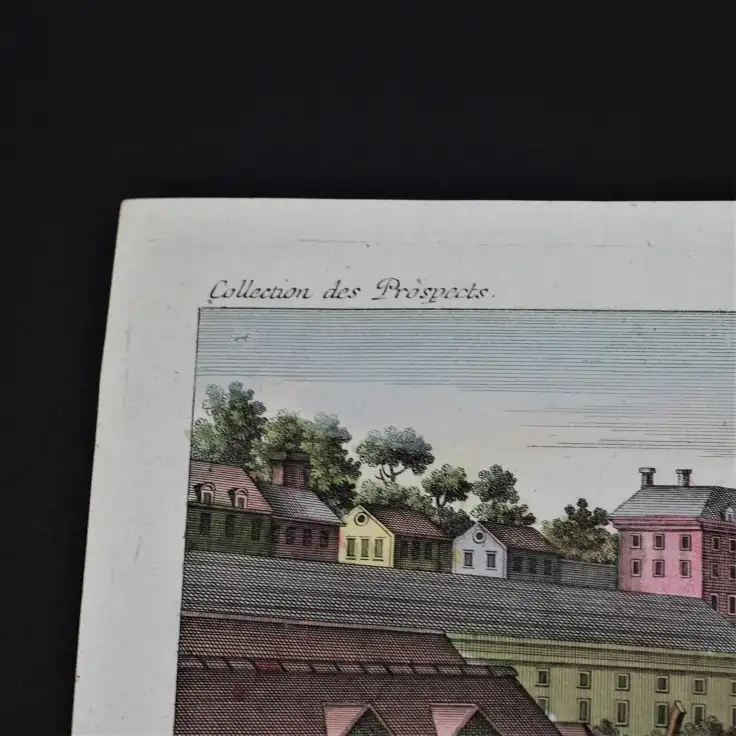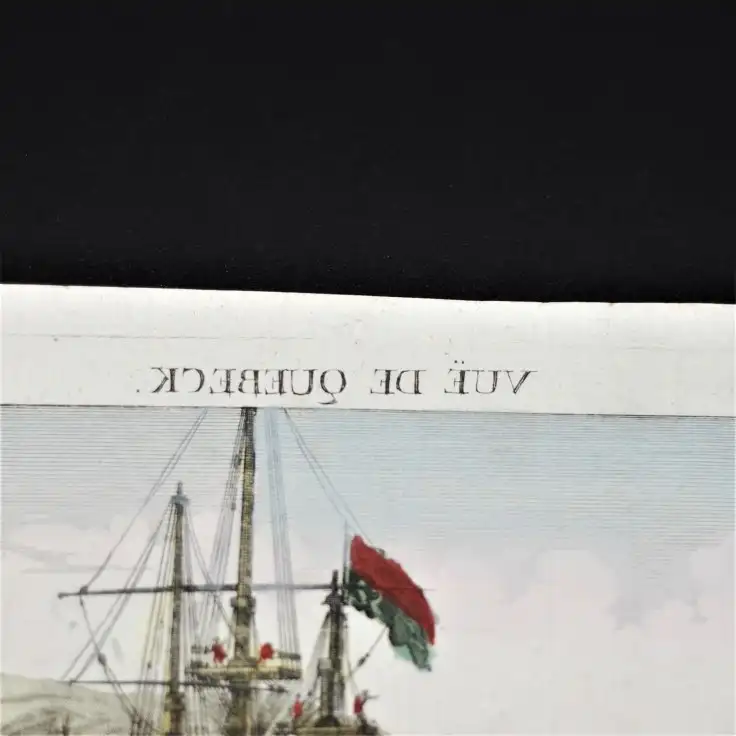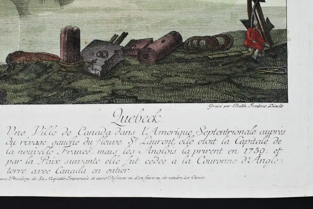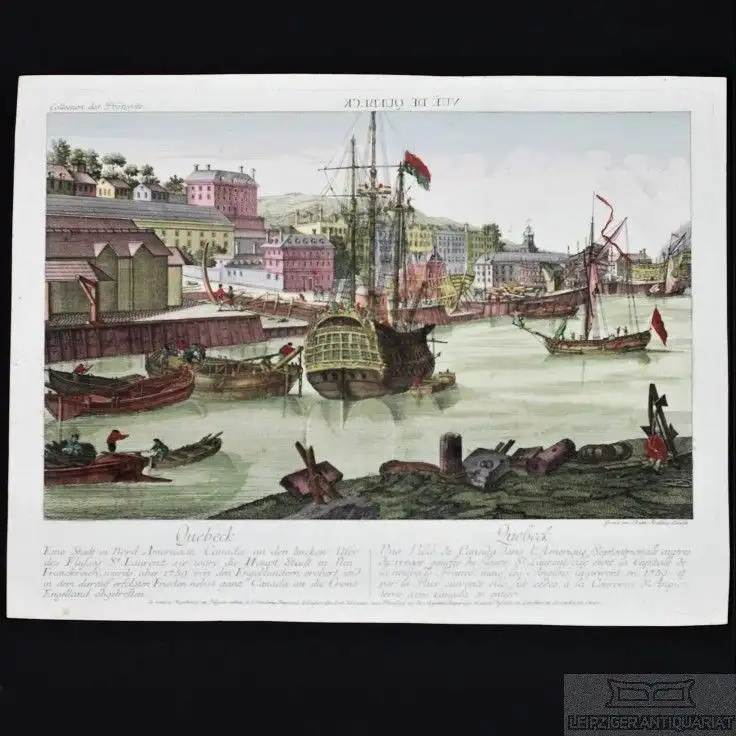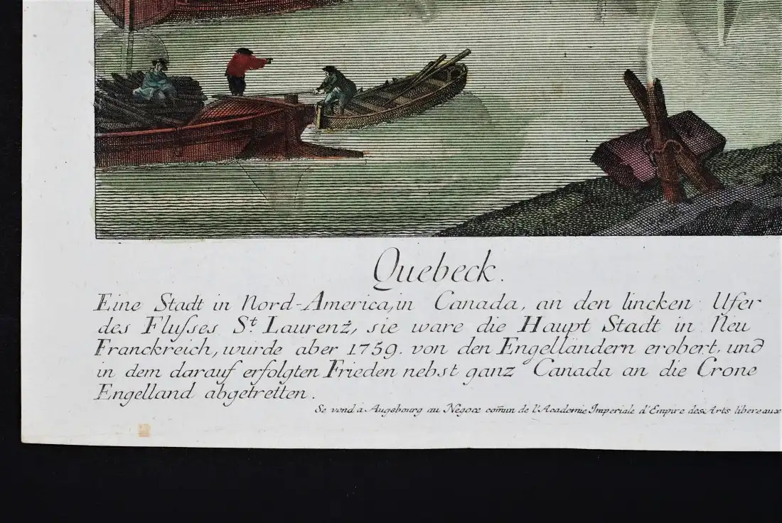 Bemerkungen: Zustand: Blatt leicht fleckig und altersbedingt minimal gebräunt, Kupferstich gebräunt, im oberen Rand etwas braunfleckig, Ecken wenig bestoßen // Altkolorierter original Kupferstich, Guckkasten-Kupferstich. Kunstgrafik. Eine Stadt in Nord-America, in Canada an den linken Ufer des Flusses St. Laurenz, sie ware die Haupt Stadt in Neu Franckreich wurde aber 1759 von den Engländern erobert , und in dem darauf folgenten Frieden nebst ganz Canada an die Crone von Engeland abgetreten. Druckgröße: 44 x 33 cm, Kaiserlich Franziskische Akademie in Augsburg, Original, coloured, copper engraving around 1780. Augsburg, B. Fr. Leizel bei Negoce