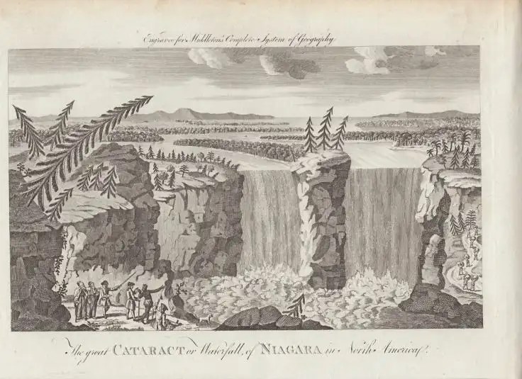 Bemerkungen: Zustand: Blatt leicht fleckig und altersbedingt minimal gebräunt, Kupferstich gebräunt, im oberen Rand etwas braunfleckig, Ecken wenig bestoßen // Original Kupferstich. Kunstgrafik. Duckgröße: 28 x 19,5 cm Kupferstich aus: Engraved for Middleton's Complete System of Geography nach Robert Hancock, Falls, Waterfall, Waterfalls, Settlers, River, Ontario, Water, Native, Native-American, Tour guide, Indian, guide, Indigenous, Views
