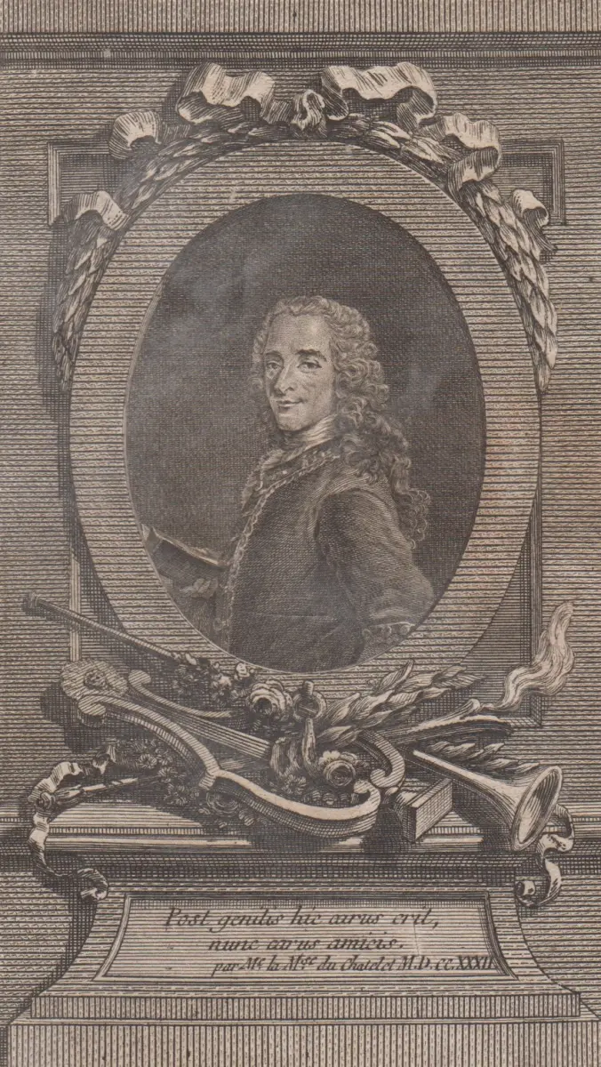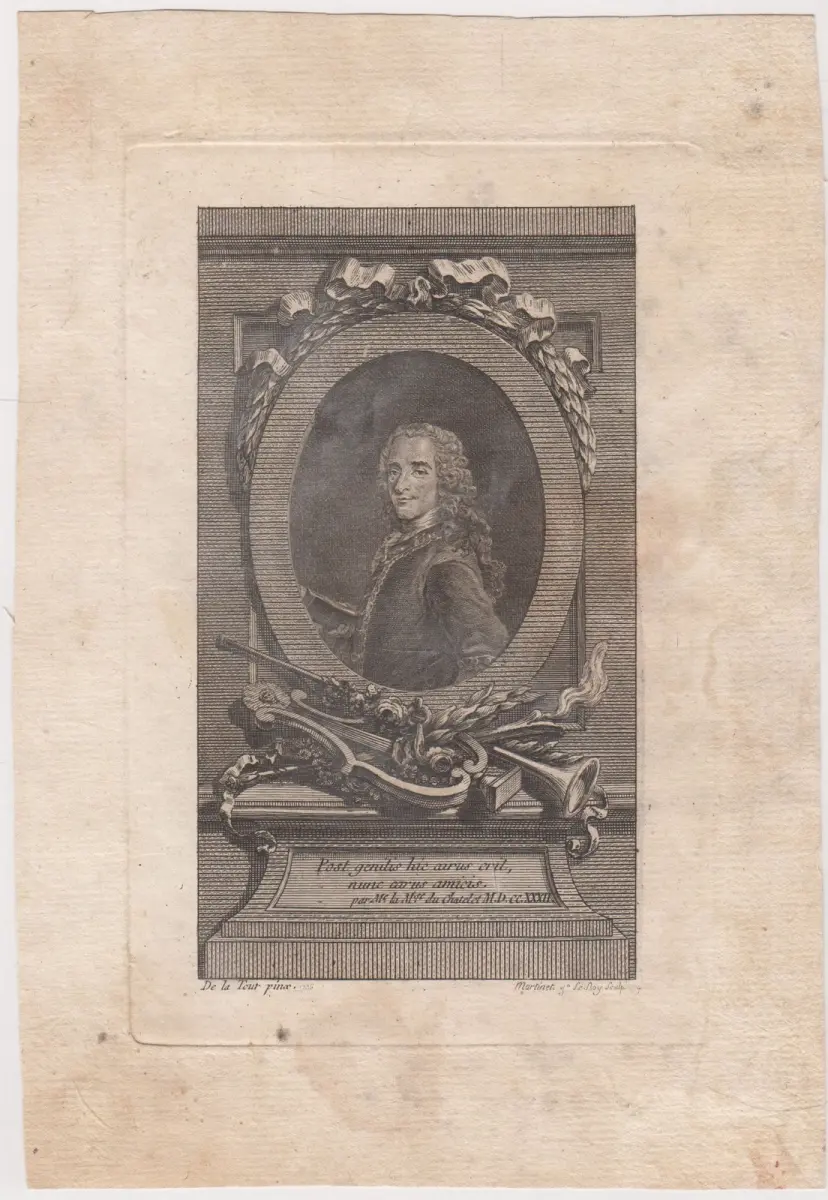 Bemerkungen: Zustand: Gut. Altersbedingt etwas gebräunt und leicht fleckig // Gut Klarer Druck auf gebräuntem und an den Rändern gering fleckigem Papier, insgesamt gut erhalten Schönes kleines Portrait des französischen Philosophen und Schriftstellers der Aufklärung Voltaire (1694-1778) nach Maurice Quentin de La Tour als Brustbild nach links gewendet mit Buch in der rechten Hand und ovaler Rahmung, geschmückt mit Blumenranken und Musikinstrumenten.