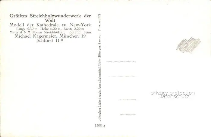 Kuriosum Modell Kathedrale New York Streichholz Unterhaltung postalisch nicht gelaufen 1921-1965 Erhaltung siehe scans Alte Ansichtskarte Postkarte PaolPID1