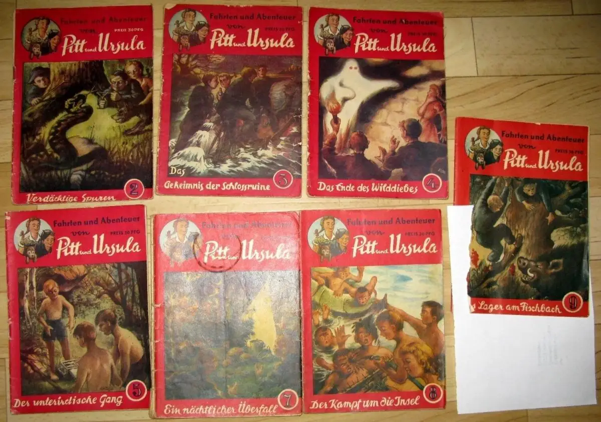 schlechter bis guter Zustand, Gebrauchs- und Alterungsspuren: Heft 2 Rücken ca. zur Hälfte gerissen - Heft 7 links ca. 15 mm eingerissen und Umschlag verschmutzt und abgenutzt, Heft senkrecht mittig geknickt - Heft 9 Vorderseite unten ca. 11 eingerissen - Heft 4 Deckel und die ersten 4 Blatt etwas schmutzfleckig - alle: Umschläge und Seiten teils mehr oder weniger eselsohrig - teils etwas knittrig - Umschläge teils leicht verschmutzt oder gering fleckig - Seiten überwiegend sauber und ordentlich - Deckel innen mit altem Besitzerstempel - diverse Kleinigkeiten, geliefert werden Ihnen die Hefte 2-5, 7-9, Softcover, ca. 14,5 x 21, je 32 Seiten mit vereinzelten Illustrationen