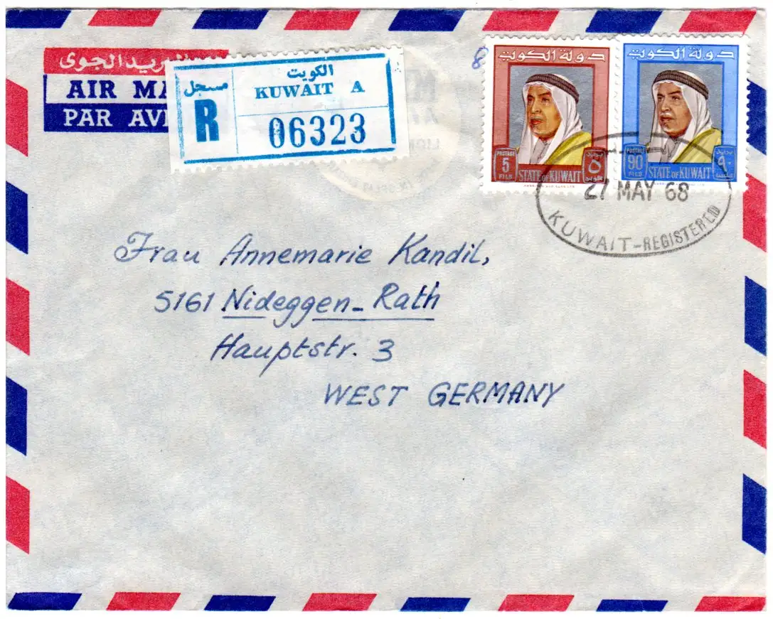 Kuwait 1968, 90+5 F. auf Luftpost Einschreiben Brief n. Deutschland