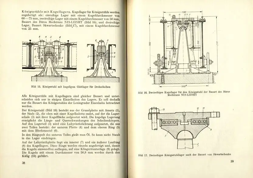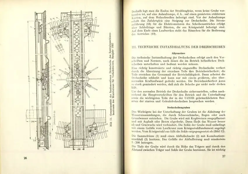 303064 guter Zustand, geringe Gebrauchs- und Alterungsspuren: Umschlag etwas vergilbt / leicht verschmutzt - Umschlag und Seiten teils etwas eselsohrig - Seiten sauber und ordentlich - Titel mit altem Bahnbetriebswerkstempel - Buchrücken mit kleiner handschriftlicher Nummerierung Mit der Übersetzung des Werkes von L. E. Konzewitsch über „Wendeeinrichtungen für Lokomotiven" schließt der Fachbuchverlag eine empfindliche Lücke im Fachschrifttum der Deutschen Reichsbahn. Die eingehende Bearbeitung aller einschlägigen Fragen durch dem sowjetischen Ingenieur Konzewitsch läßt den hohen Stand der Lokomotivtechnik in der Sowjetunion klar erkennen. Dabei ist der Stoff vom Verfasser so einfach und logisch klar behandelt, daß er für jeden Eisenbahner leicht verständlich ist. Von besonderer Bedeutung für unsere Reichsbahn ist das vom Verfasser eingehend behandelte Problem der Festlegung der persönlichen Verantwortlichkeit und Zuständigkeit für besondere Arbeiten an den Wendeeinrichtungen. Auch hier überrascht die Gründlichkeit, mit der unser sowjetischer Freund diese Frage ausschöpft. Sie zeigt aber auch, welche große Bedeutung die persönliche Verantwortung in der Sowjetunion hat und wie man mit ihrer Hilfe eine genaue Kontrolle bei Neueinrichtungen und Reparaturen durchführt. Für das betriebsmaschinentechnische Personal der Deutschen Reichsbahn ist das Buch nicht nur in fachtechnischen Fragen eine unerschöpfliche Fundgrube, sondern es gibt gleichzeitig eine Fülle Von Anregungen und Hinweisen über die Verbesserung des Arbeitsablaufs und der Kontrolle. Es hilft, den Kreis der Verantwortlichen bis ins kleinste festzulegen, um dadurch zu wesentlich besseren Arbeitsergebnissen zu kommen. Die leitenden Funktionäre der Direktionen, Ämter und Dienststeller, Ingenieure und Techniker, Meister und Schlosser erhalten mit dieser Übersetzung ein wertvolles Mittel, um auch im Betriebsmaschinendienst der Deutschen Reichsbahn die Methoden und die Technik unserer sowjetischen Freunde erfolgreich anzuwenden. Der Zentralvorstand der Industriegewerkschaft Eisenbahn begrüßt deshalb die Herausgabe dieses Buches und wünscht ihm eine weite Verbreitung, besonders unter den Eisenbahnern des Betriebsmaschinendienstes." - EINTEILUNG DER WENDEEINRICHTUNGEN - Allgemeines - Drehscheiben - Gleisdreiecke zum Wenden von Lokomotiven - Gleisfünfecke zum Wenden von Lokomotiven - Gleisschleifen zum Wenden von Lokomotiven - BESCHREIBUNG DER DREHSCHEIBEN - Allgemeines - Einteilung der Drehscheiben - Auswahl der Drehscheibenbauart - Aufstellung der Drehscheiben auf dem Gelände des Bw - Drehscheibe der früheren St. Petersburger Metallfabrik - Drehscheiben mit ebener und kugeliger Lagerung - Drehscheiben mit Rollenlagern - Drehscheibe nach der Konstruktion des Büros Mechtrans NIS-LIISHT - Gelenkdrehscheibe des Werkes „Krasny Profintern", Brjansk, Baujahr 1935 - Drehscheibe ohne Fundament nach dem Entwurf des Zentralmaschinenbautrusts des Ministeriums für Verkehrswesen, Baujahr 1937 - TECHNISCHE INSTANDHALTUNG DER DREHSCHEIBEN - Allgemeines - Drehscheibengruben - Drehscheibenkörper - Königsstuhl - Laufräder der Drehscheiben - Antriebsarten der Scheiben - Ölen der bewegten Drehscheibenteile - AUSBESSERUNG DER DREHSCHEIBEN - Allgemeines - Ausbesserung des Fundaments und der Seitenwände der Gruben - Ausbesserung des Scheibenkörpers - Feststellung der Verformung des Scheibenkörpers - Ausbesserung der Königsstühle - Bestimmung des Mittelpunktes der Drehscheibe und Festlegung der Gleisachsen für die Zufahrtgleise - Nivellement des Laufkranzes einer Drehscheibe - Überprüfung der konzentrischen Lage der Laufkränze - Freihaltung des Lichtraumes auf den Drehscheiben - Unterhaltung der Laufräder einer fundamentlosen Drehscheibe Unterhaltung der Scheibenantriebe - ARBEITSSCHUTZBESTIMMUNGEN - Allgemeines - Bedienung der Drehscheibe - Arbeitsschutz beim Ausbessern der Drehscheibe - ANLAGE 1: Berechnung der Belastung einer Drehscheibe bei Gleichgewichtslage der Lokomotive - ANLAGE 2: Achsenabstände und Achsdrücke einiger Lokomotiv- und Tenderbauarten bei den Eisenbahnen der UdSSR - ANLAGE 3: Getriebeanordnungen für Drehscheibenantriebe - ANLAGE 4: Aufstellung des Materialbedarfes für die Herstellung der wichtigsten Drehscheibenteile, kartoniert, ca. 15 x 21, 118 Seiten mit 79 Bildern