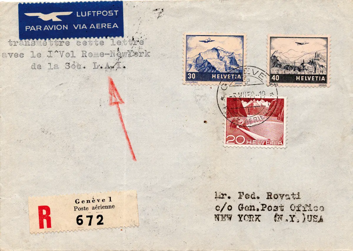 Umschlag - L.A.I. I. Flug (Schweiz) Rom/New York vom 5.7.50 - Einschreiben von Genf nach New York mit dem I. Flug (via Roma) der LAI (Pellegrini Nr. 366, unveröffentlicht) - hinten Ann. des Fluges und Ann. bei Ankunft - Seltener, nicht erwähnter Pilgerkatalog Cod. 671/17