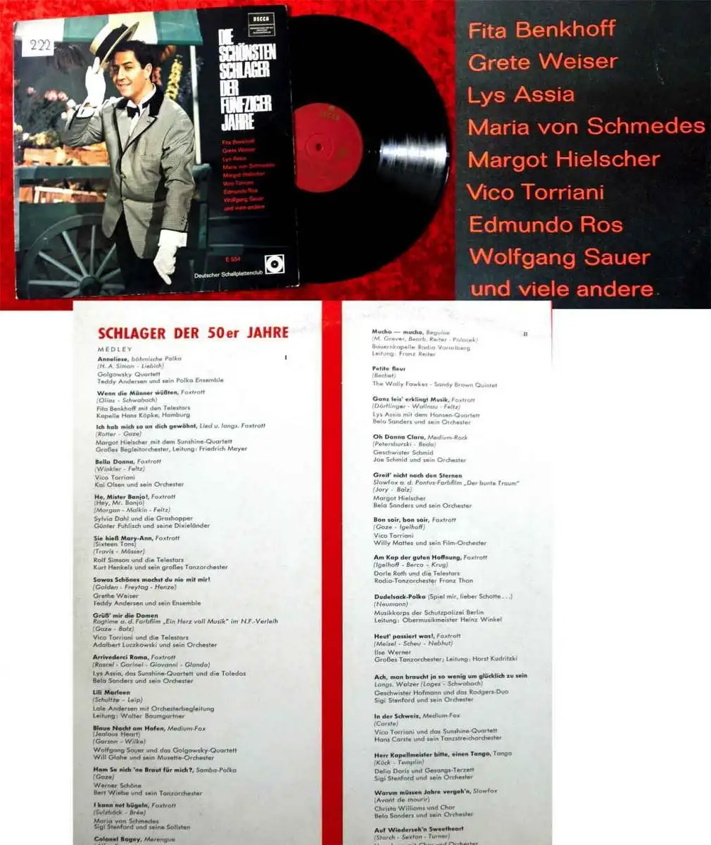 sehr seltenes Originalalbum, Decca Records, Deutscher Schallplattenclub E 554, Nummernaufkleber auf Frontcover, das Cover zeigt den Entertainer Vico Torriani; Mitwirkende: Vico Torriani, Margot Hielscher, Lys Assia, Edmundo Ros, Dorle Rath, Fita Benkhoff, Sylvia Dahl, Golgowsky Quartett, Grethe Weiser, Lale Andersen, Wolfgang Sauer, Werner Schöne, Maria von Schmedes, Wally Fawkes, Geschwister Schmid, Ilse Werner, Geschwister Hofmann, Delia Doris, Christa Williams, Vera Lynn, Franz Thon, Günther Fuhlisch, Hans Carste, Bela Sanders, Telestars, Sandy Brown Quintet u.a.-