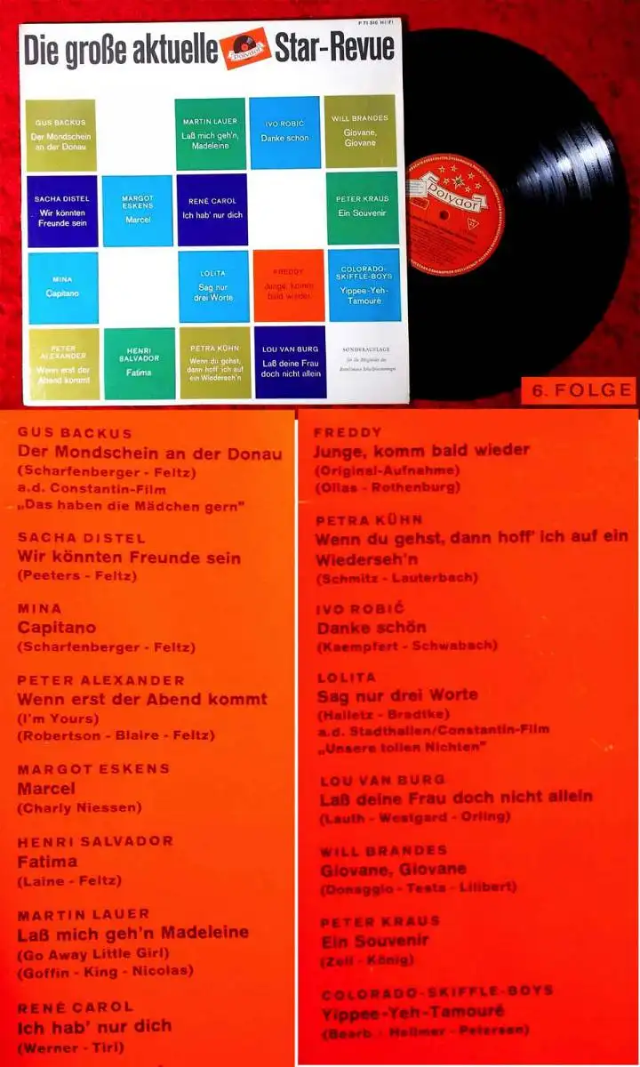 Originalalbum, Polydor Records, Sonderauflage für die Mitglieder des Bertelsmann Schallplattenringes, 1963, mit Gus Backus, Peter Kraus, Mina, Sacha Distel, Henri Salvador, Peter Alexander, Margot Eskens, Martin Lauer, René Carol, Freddy Quinn, Petra Kühn, Ivo Robic, Lolita, Will Brandes, Lou van Burg, Colorado Skiffle Boys