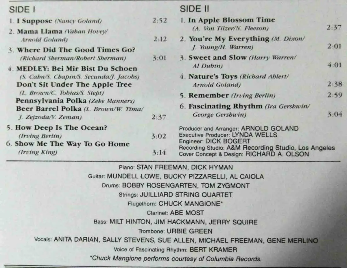 Soloalabum von Maxene Andrews von den legendären Andrews Sisters; 1985, feat Mundell Lowe, Bucky Pizzarelli, Al Caiola, Juliiard String Quartet, Urbie Green, Chuck Mangione, Abe Most u.a.-