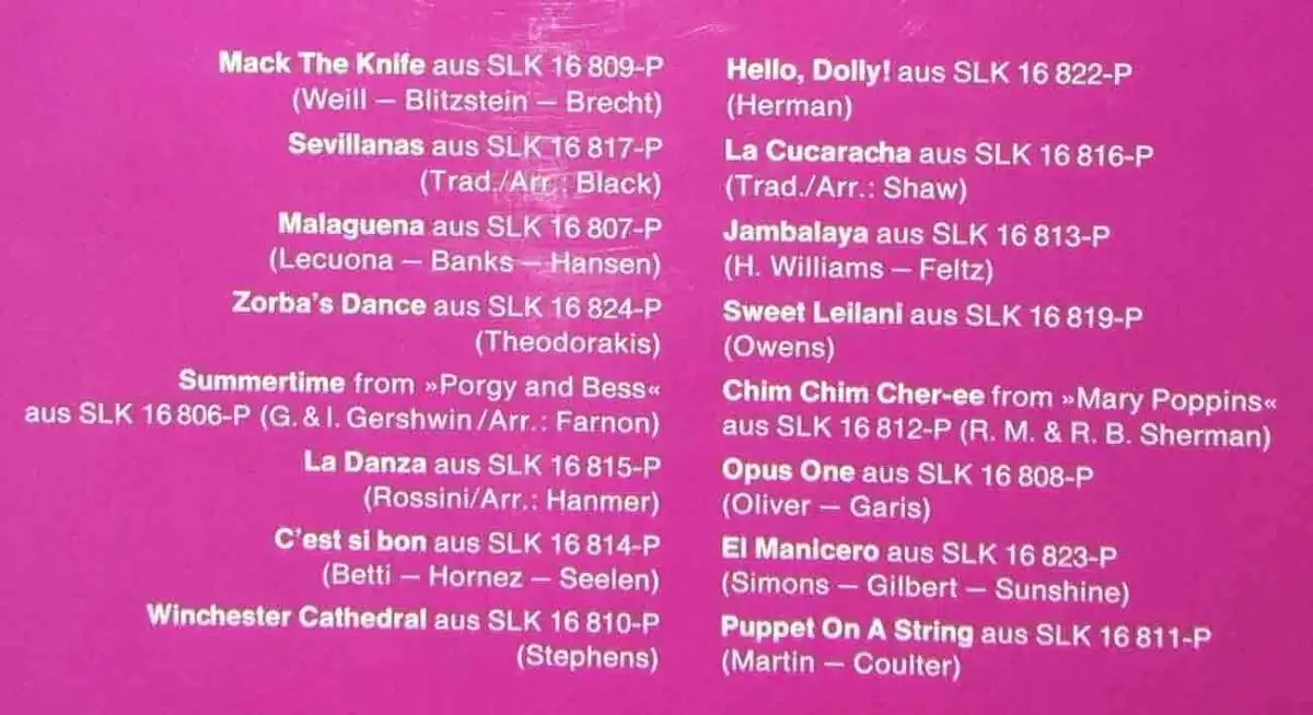 mit Edmundo Ros, Ted Heath, Werner Müller, Johnny Keating, Frank Chacksfield, Stanley Black, Roger Laredo, Maurice Larcange, Robert Farnon, Alan Tew, Robert Shaw, Ronnie Aldrich, Los Machucambos u.a.-
