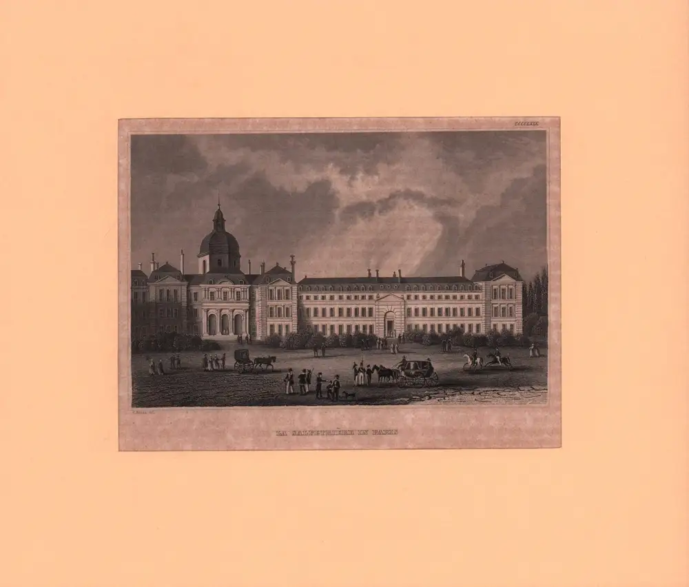 Das 1656 erbaute Krankenhaus Hôpital de la Salpêtrière in Paris war im 19. Jahrhundert die wohl bekannteste psychiatrische Anstalt Europas, mit bis zu 8000 Patienten. - Streifig gebräunt