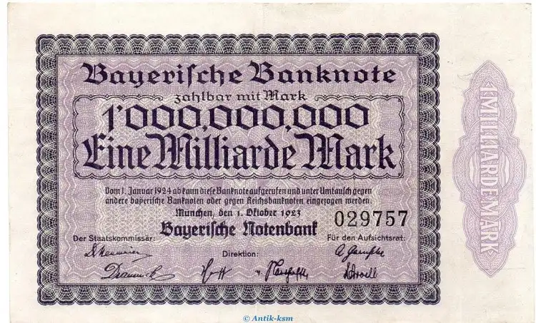 Reichsbanknote über Eine Milliarde Mark von 1923 , Länderbank Bayern - InflationGrabowski / Rosenberg / Pick : BAY-17 / 732 / S.936
