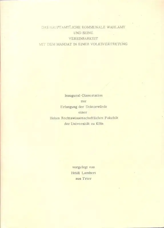 Lambert, Heidi: Das hauptamtliche kommunale Wahlamt und seine Vereinbarkeit mit dem Mandat in einer Volksvertretung. <Dissertation>.