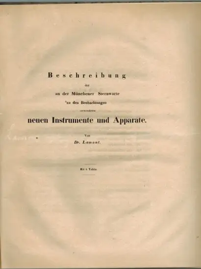 Erste Ausgabe dieser interessanten Beschreibung, die vor allem für die astronomische Instrumentenkunde von sehr großem Interesse ist. Lamont war Professor der Astronomie in München und Leiter der Sternwarte Bogenhausen. Beschrieben werden meteorologische und magnetische Registrier-Instrumente, der galvanische Zeitregistrierungs-Apparat, das Elektrometer, das galvanische Pendel, der Höhensektor, das Differential-Inklinatorium und die magnetische Waage. Sehr gutes Exemplar