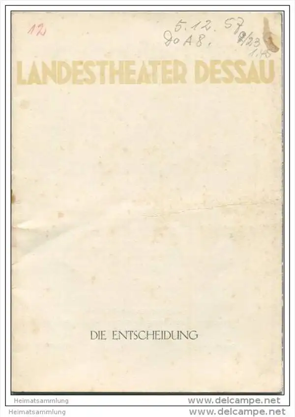 Landestheater Dessau - Spielzeit 1957/58 Nummer 11 - Programmheft Die Entscheidung von Konstantin A. Trnjow - Erica Kuppi Heinz Behrens - Irene Marwitz - Gebrauchsspuren - Heftklammern rostig - Seiten gelöst - Einband stark fleckig (EP5304)