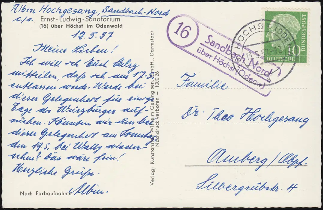 Landpost 16 Sandbach Nord au-dessus de HÖCHST (ODENWALD) 13.5.1957 à AK Sanatorium