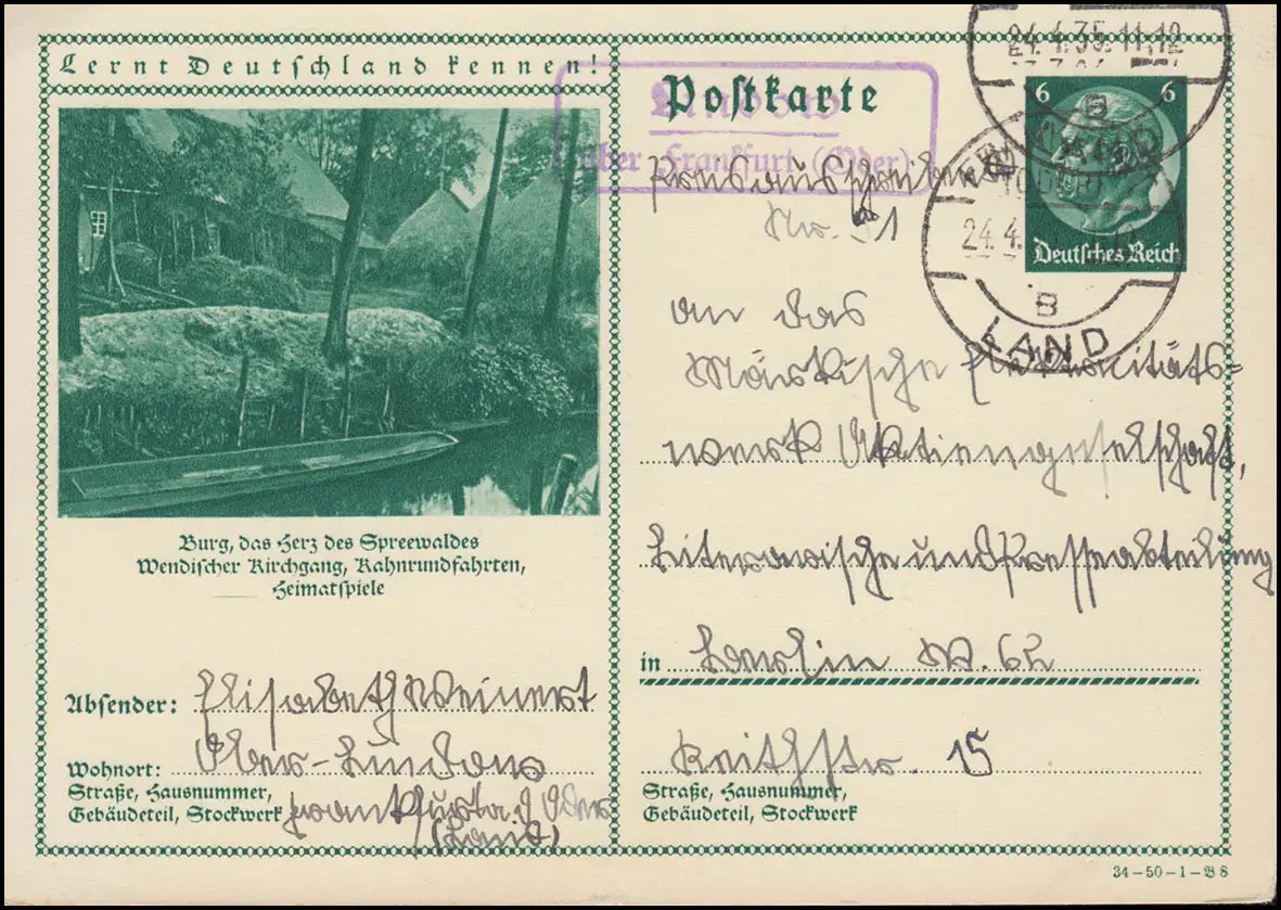 Landpost Lindow sur FRANKFURT (ODER) LAND 24.4.35 sur carte postale de Berlin