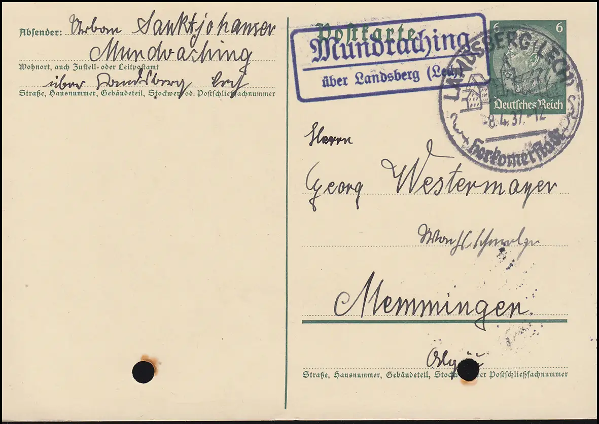 Landpost Mundraching via Landsberg 2 sur carte postale P 226I, SSt LANDSBERG 8.4.37