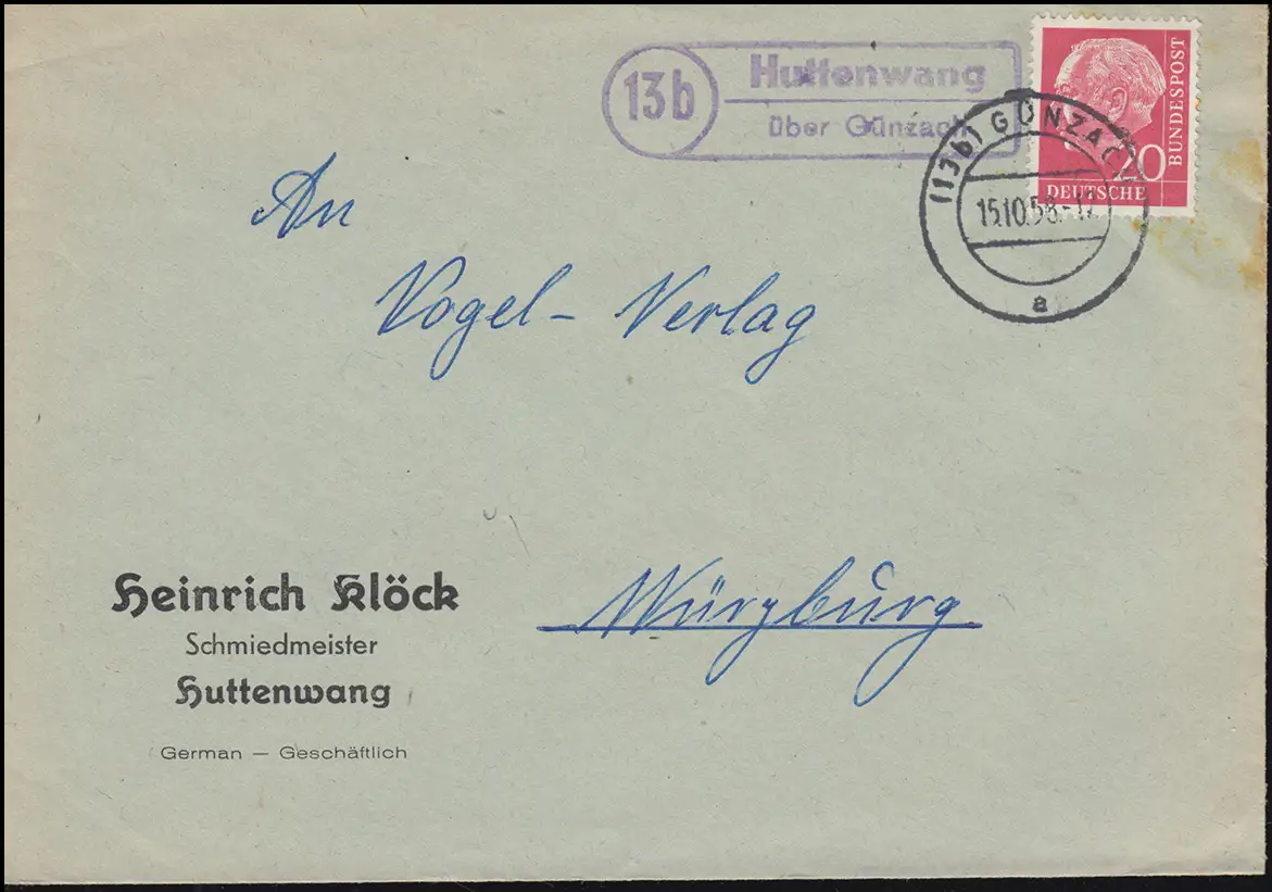 Landpost-Stempel Huttenwang sur GÜNZACH 15.10.1958 Lettre Maître Forgeron Klöck