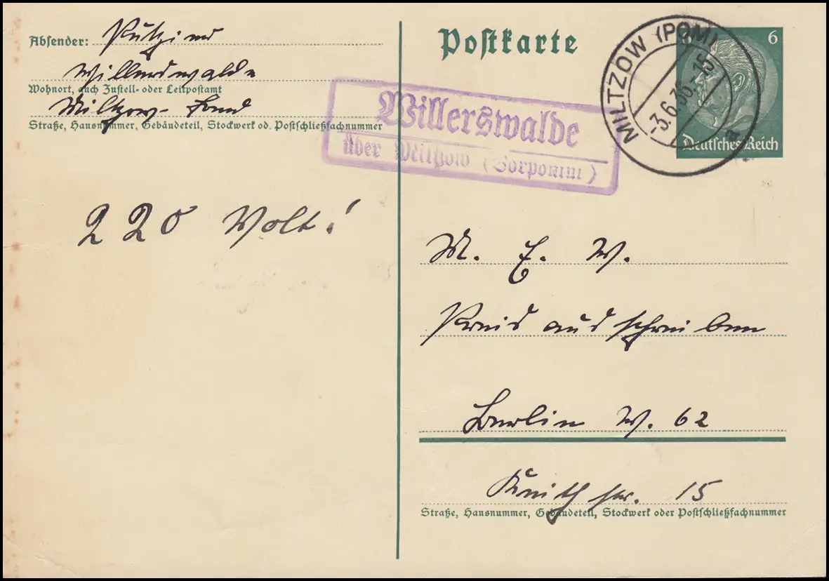 Pays-Bas: Willerswalde sur MILTZOW (POMMERN) 3.6.1936 sur carte postale Hindenburg