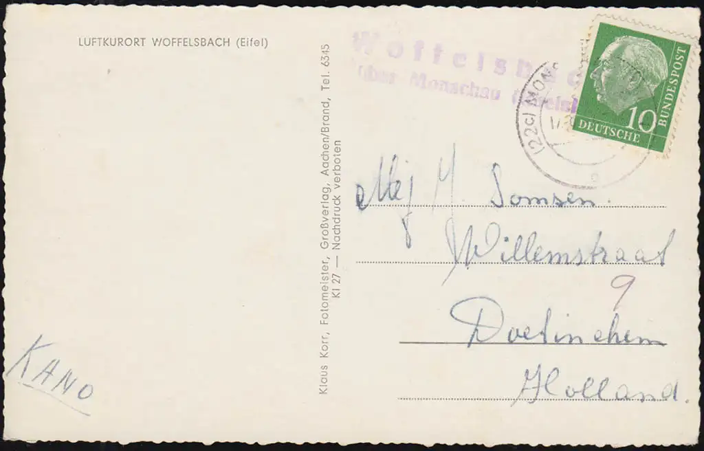 Landpost Woffelsbach sur MONSCHAU 17.8.1962 sur carte de vue appropriée