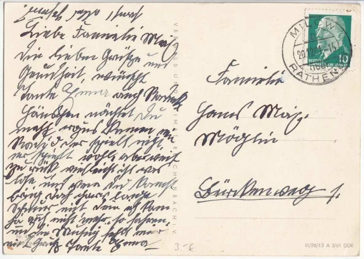 Beleg, Ansichtskarte, Michel 846 EFLandpoststempel, Poststelle I, Milow über Rathenow, 20.12.61 Nebenstempel: keine Anmerkungen: keine