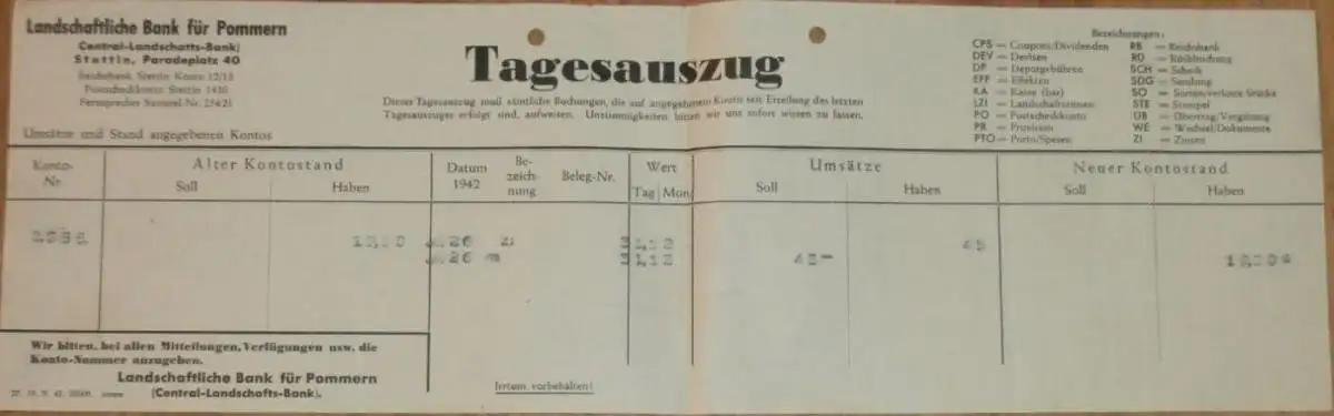 Landschaftliche Bank für Pommern in Stettin , 1941 , Sparkasse , Auszug , Konto !!!