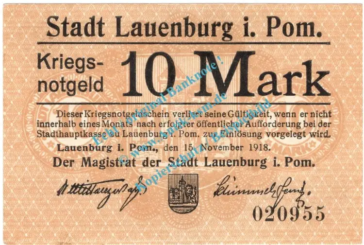 Gutschein / Banknote über Zehn Mark , Stadt Lauenburg i.Pom. Großnotgeld 1918Bundesland : Pommern , Geiger : 310.02.a