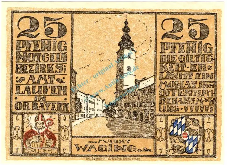 Laufen , Notgeld 25 Pfennig Schein in unc-kfr. Ti.3925.05.10 , Bayern 1920 Verkehrsausgabe