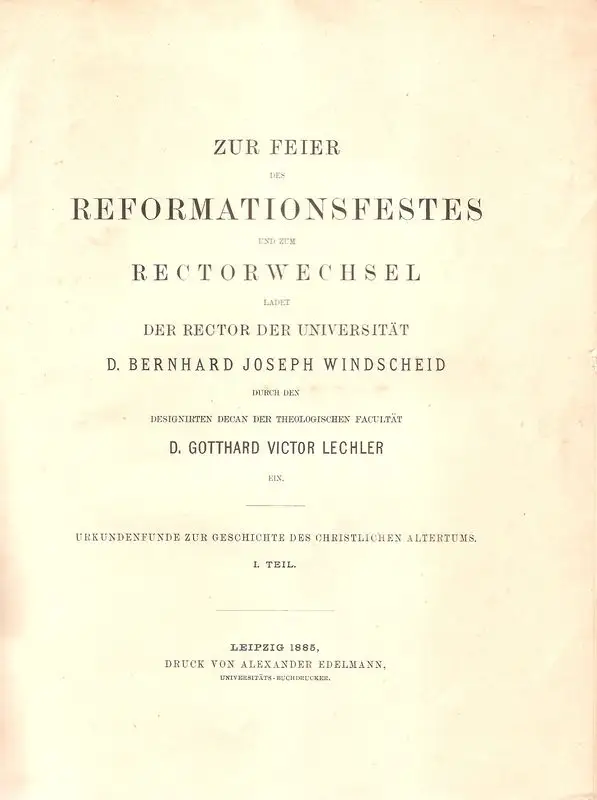 Lechler, Gotthard Victor: Urkundenfunde zur Geschichte des christlichen Alterthums I. Theil. + II. Theil (in 1 Bd.). (Zur Feier des Reformationsfestes und zum Rectorwechsel ladet der Rector der Universität D. Bernhard Joseph Windscheid durch den designir