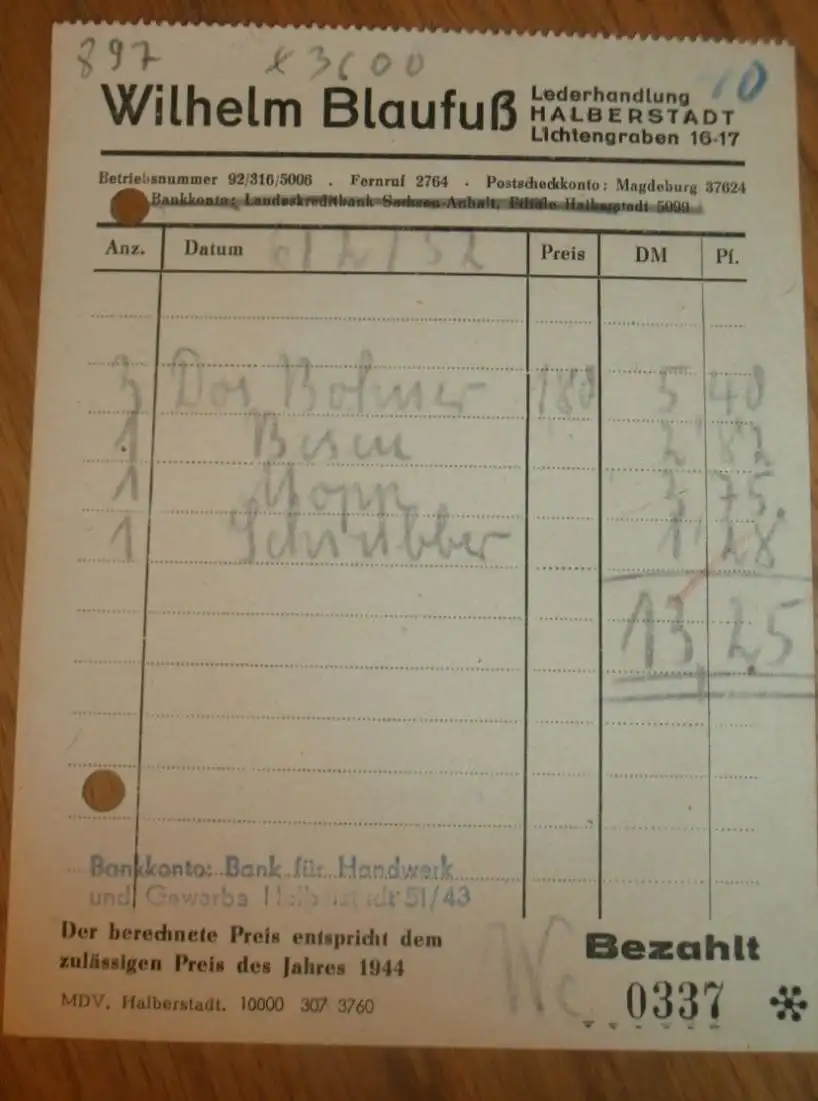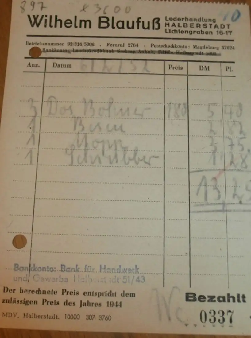 Lederhandlung - Wilhelm Blaufuß in Halberstadt , 1944 , alte Rechnung , Reklame / Werbung !!AZ-WR/1M